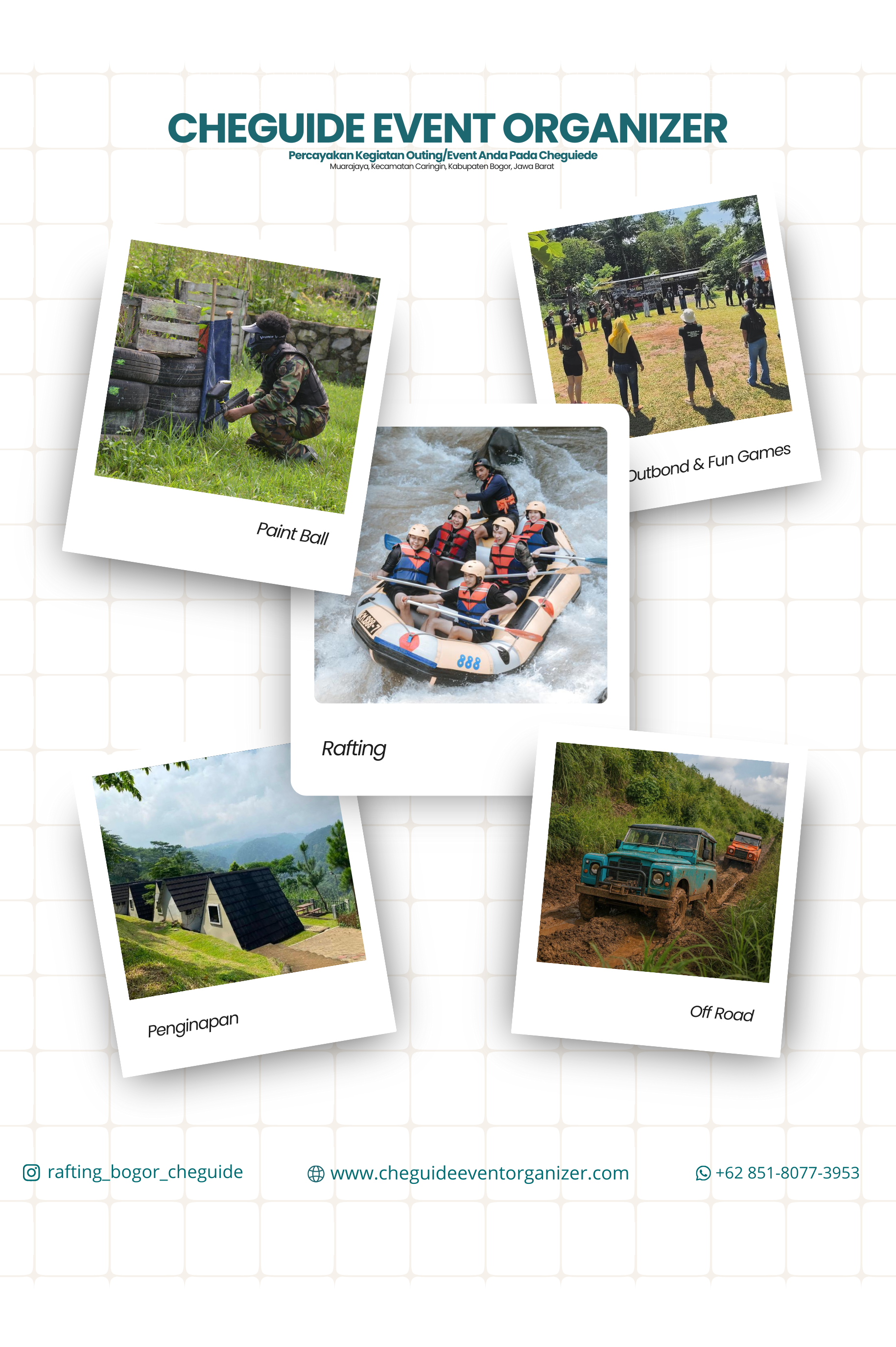 PT Cheguide Wisata Air adalah perusahaan jasa wisata outdoor yang berlokasi di Bogor, Jawa Barat, dan berfokus pada penyelenggaraan kegiatan outing, rafting Cisadane, outbound, fun games, off-road adventure, paintball, serta paket menginap untuk perusahaan, lembaga, komunitas, dan keluarga. Cheguide berpengalaman menangani ratusan klien corporate dengan komitmen memberikan aktivitas outdoor yang aman, profesional, dan menyenangkan.