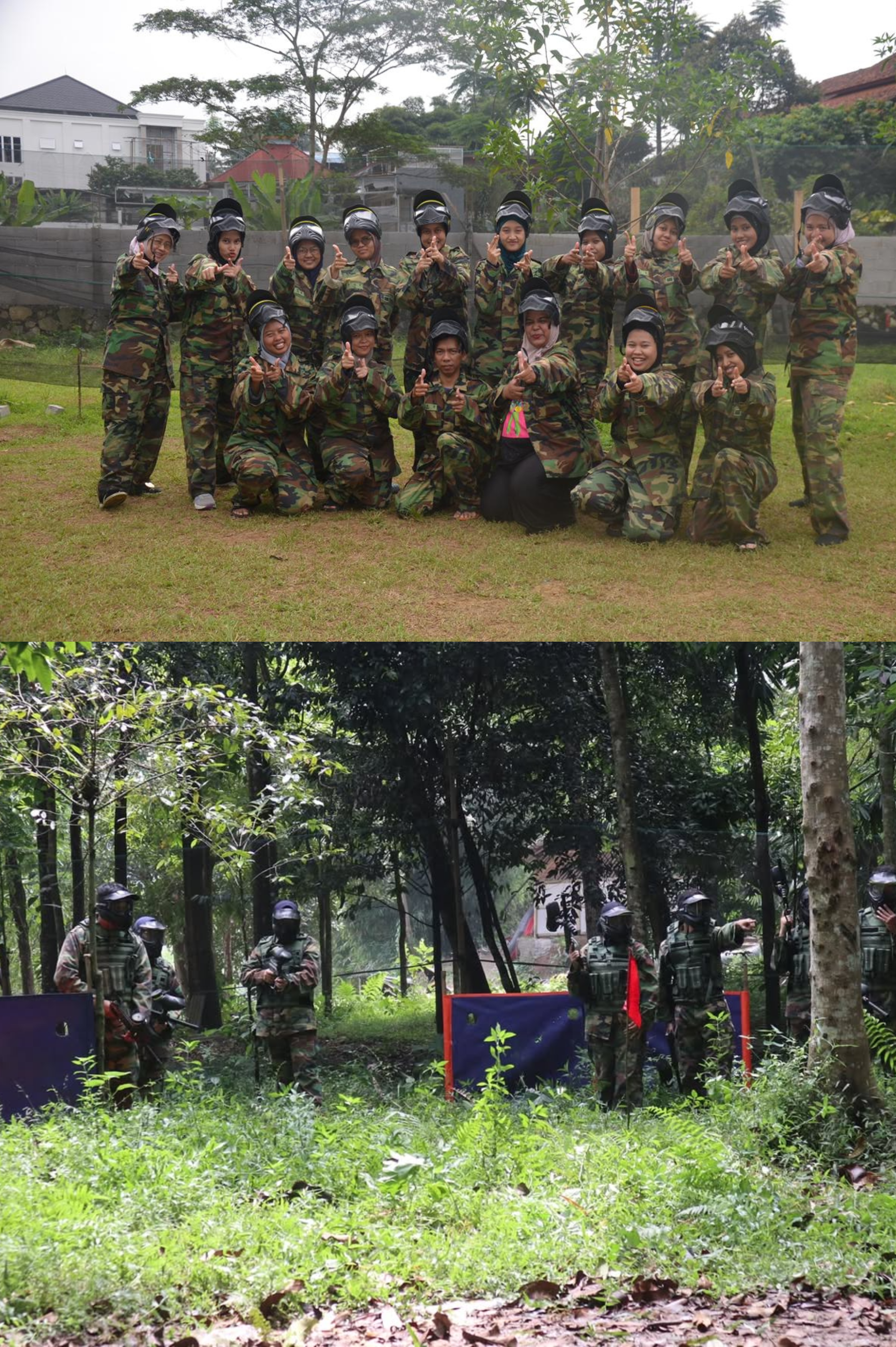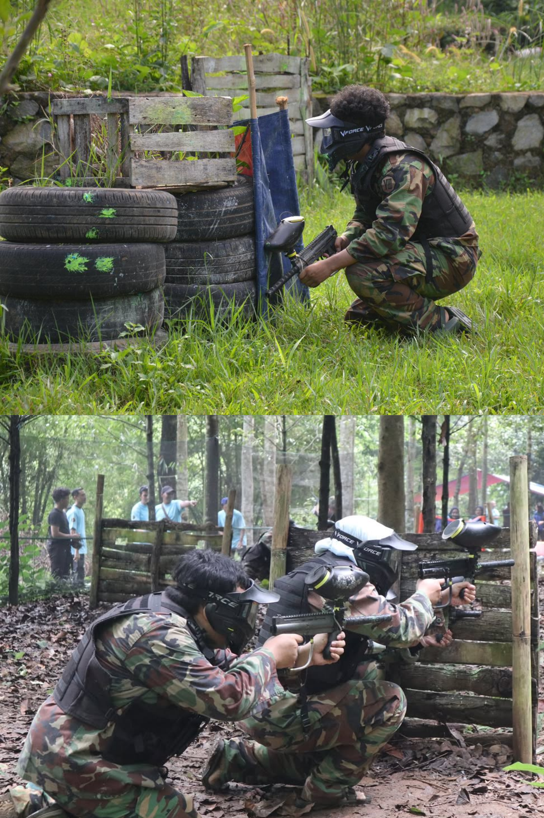 Paket paintball lengkap dengan peralatan, pelindung, arena, dan marshal profesional.
